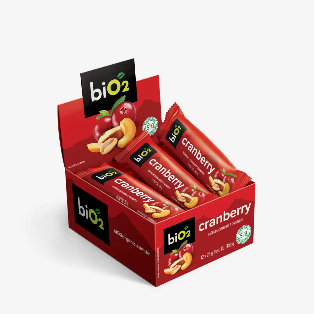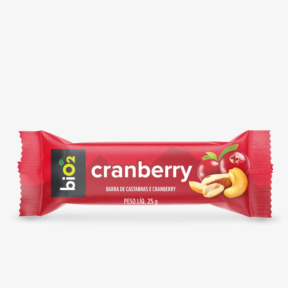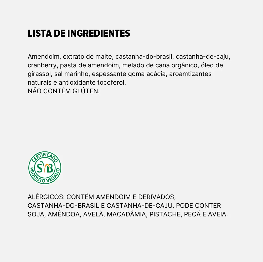 Amendoim, extrato de malte sem glúten, castanha do Brasil, castanha de caju, cranberry, pasta de amendoim, melado de cana orgânico, óleo de girassol, sal marinho, espessante goma acácia, aromatizantes naturais e antioxidante tocoferol.