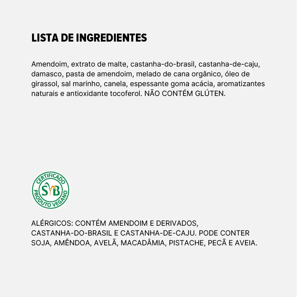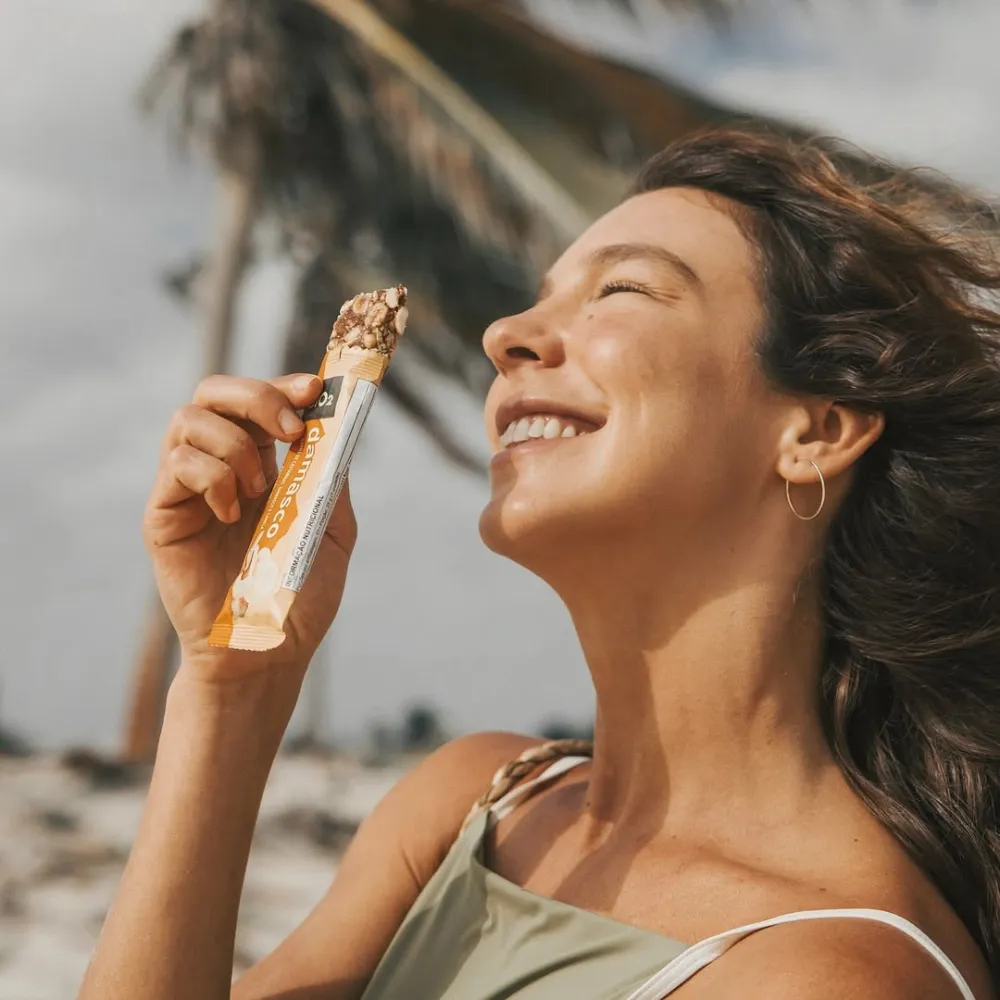Barra de castanhas crocantes e damasco caramelizado, vegana e sem glúten.