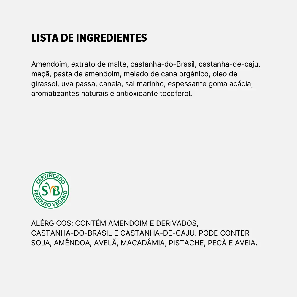amendoim, extrato de malte, castanha-doBrasil, castanha-de-caju, maçã, pasta de amendoim, melado de cana orgânico, óleo de girassol, uva passa, canela, sal marinho, espessante goma acácia, aromatizantes naturais e antioxidante tocoferol.