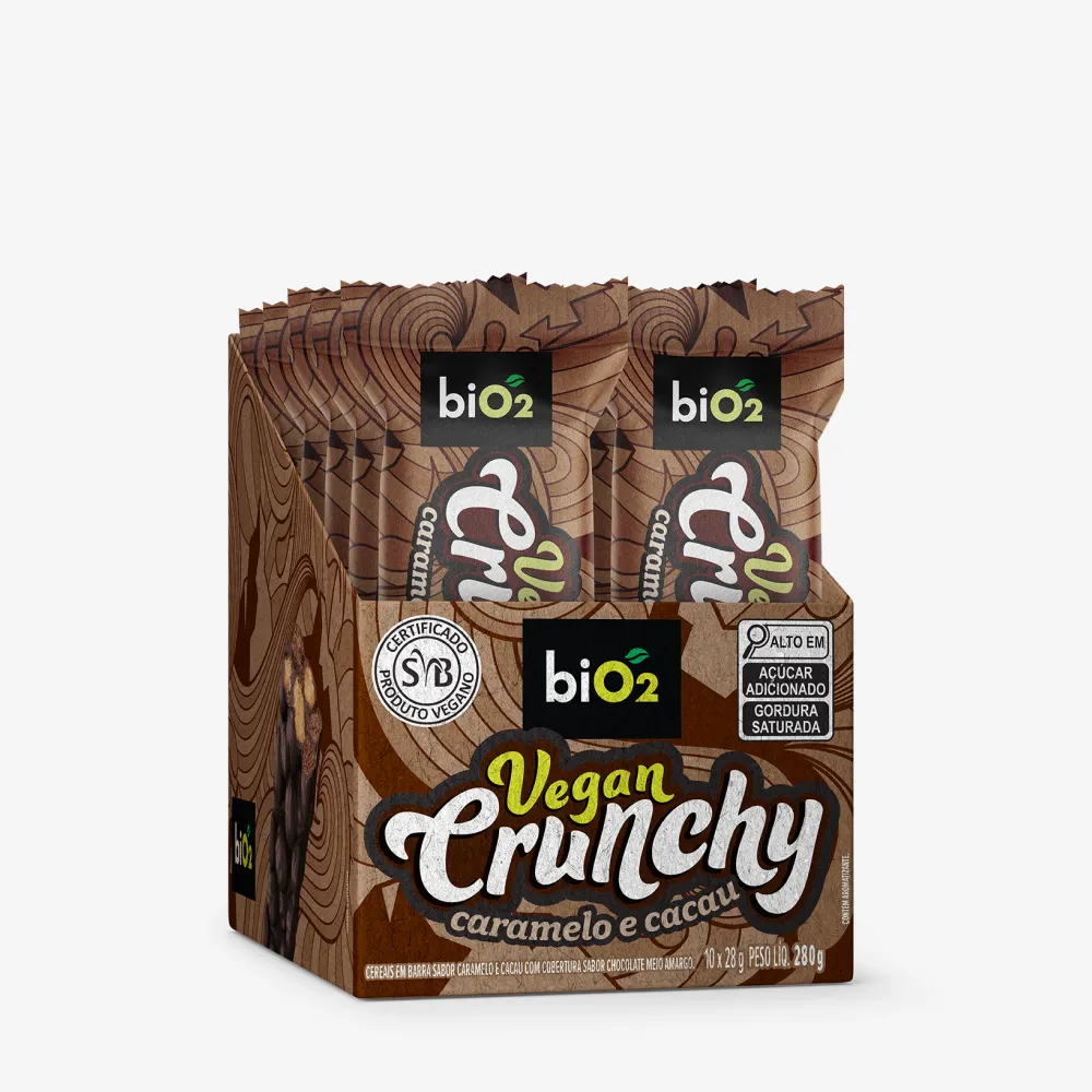 Barra de cereais crocantes sabor caramelo e cacau cobertas com um saboroso chocolate meio amargo.