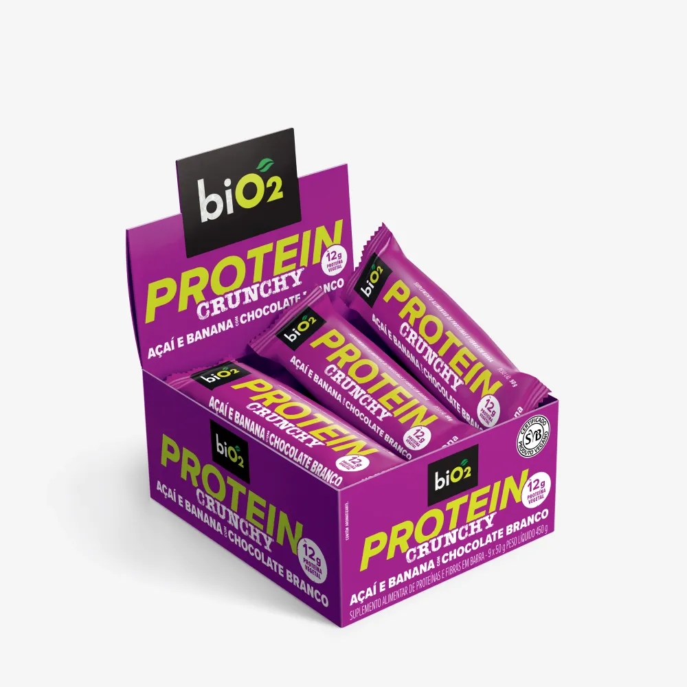Uma biO2 Protein Crunchy Bar oferece 12 g de proteínas vegetais de alta qualidade, proporcionando 23% da sua necessidade diária de proteínas, essenciais na formação de tecidos, na manutenção e aumento da massa muscular, recuperação dos músculos após exercício físico, além de manter uma sensação de saciedade por mais tempo.