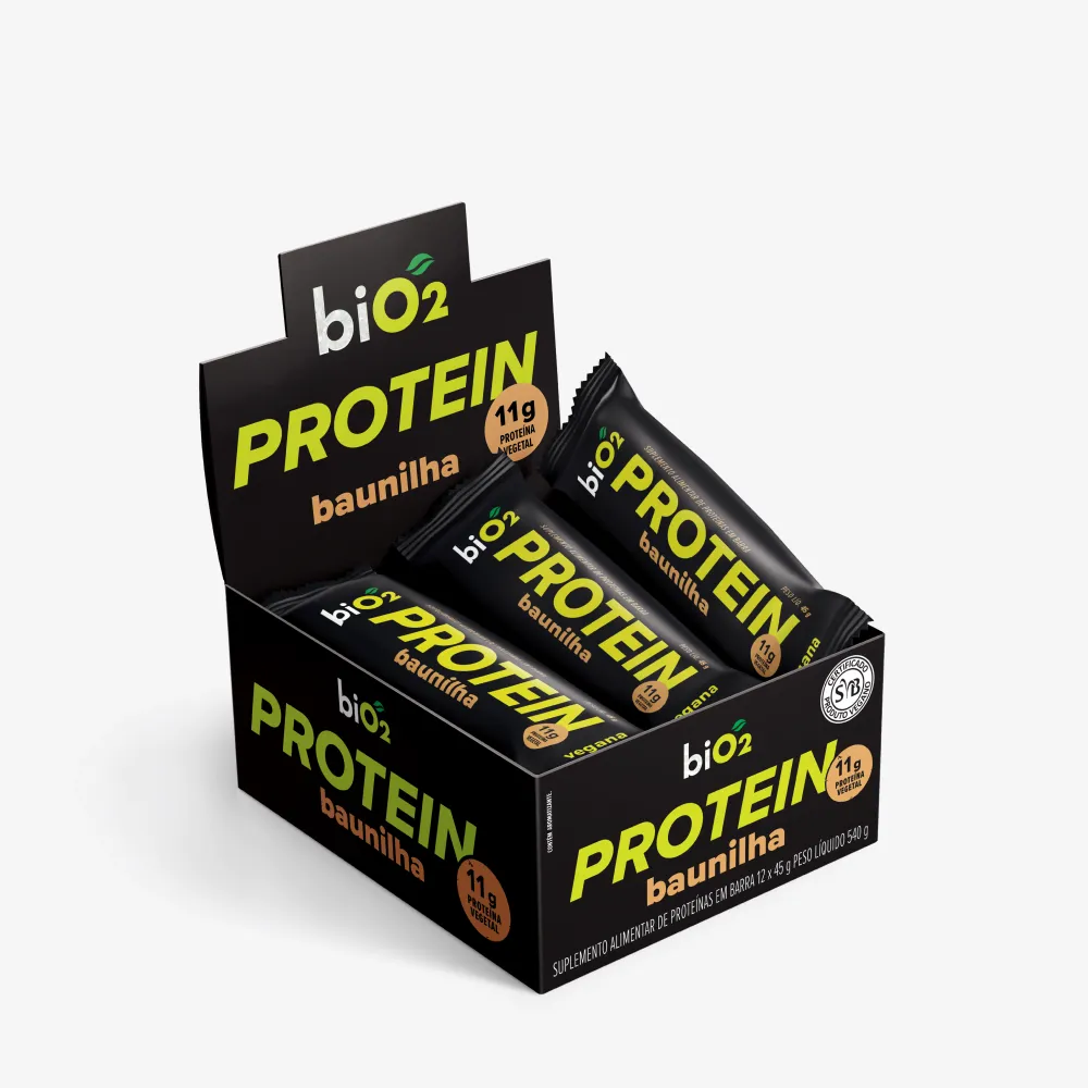 Alimento em barra fonte de proteína com cobertura sabor chocolate meio amargo.
