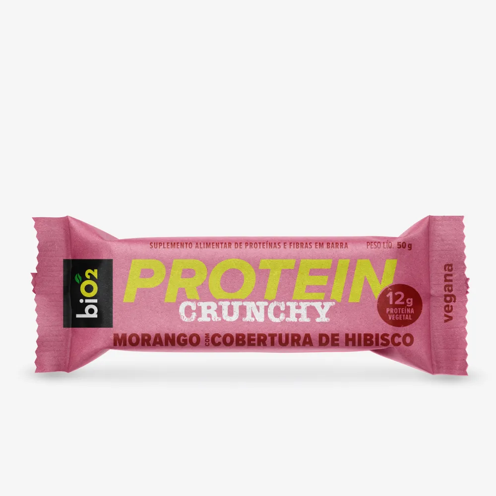 Uma biO2 Protein Crunchy Bar oferece 12 g de proteínas vegetais de alta qualidade, proporcionando 23% da sua necessidade diária de proteínas, essenciais na formação de tecidos, na manutenção e aumento da massa muscular, recuperação dos músculos após exercício físico, além de manter uma sensação de saciedade por mais tempo.