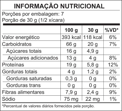 Farinha de arroz integral orgânica, extrato de malte, farinha de quinoa orgânica, açúcar demerara orgânico, farinha de chia, cacau em pó orgânico, melado de cana orgânico, farinha de feijão branco, farinha de amaranto orgânico, cacau preto, espessante goma acácia e aromatizantes naturais. NÃO CONTÉM GLÚTEN.