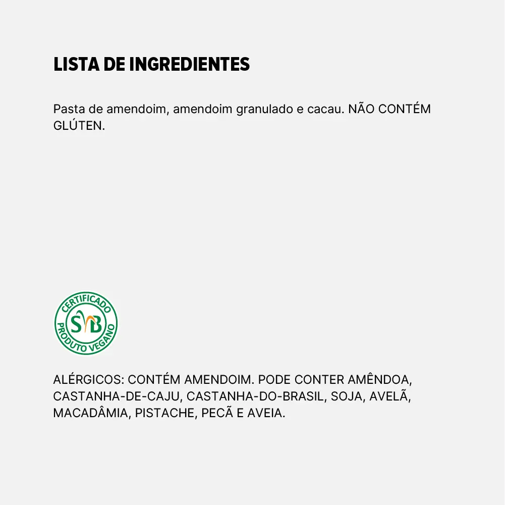 Pasta de amendoim crocante com pedaços de amendoim e cacau, feita com apenas 2 ingredientes: amendoim e cacau 100%. Vegana, sem glúten e sem adição de açúcar.