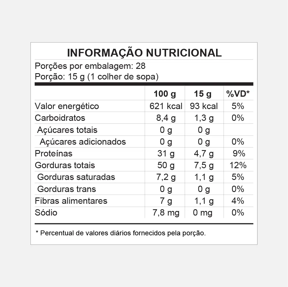 Porções por embalagem: 28 Porção: 15 g (1 colheres de sopa)