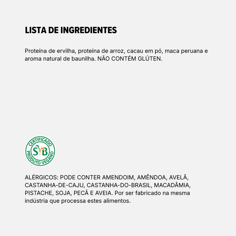 Proteína vegetal de arroz e ervilha sabor cacau com maca peruana. Vegana e Sem glúten.